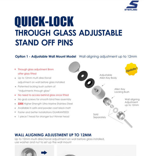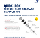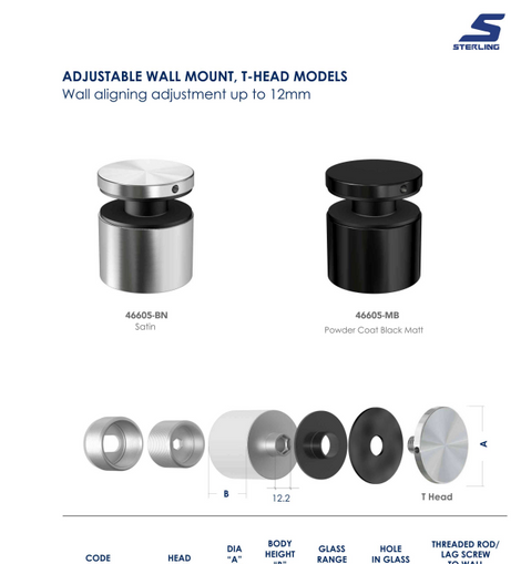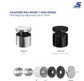 The 46605-QUICK LOCK STANDOFF is an adjustable T-head wall mount designed for precise multi-directional positioning up to 12mm before glass installation. Crafted from high-strength ultra marine stainless steel, it ensures durability and corrosion resistance. Installation requires a washer and nut to secure the mount, while the threaded rod or lag screw to attach it to the wall is sold separately. Available in satin and matte black powder-coated finishes, this standoff combines functionality with a refined aesthetic for professional-grade hardware solutions.